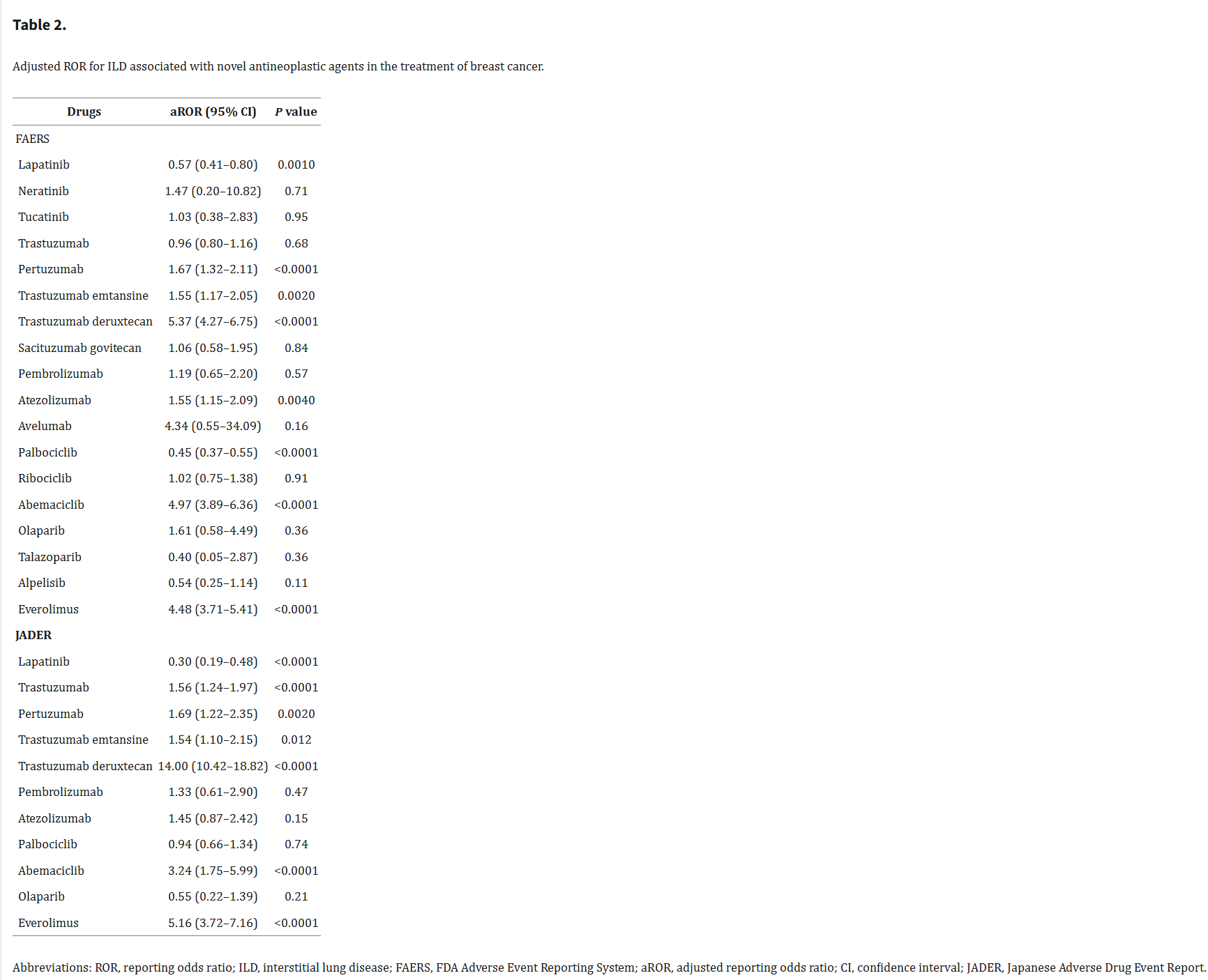 在FAERS中使用多變量logistic回歸分析調(diào)整混雜因素后,我們確定了6個(gè)可能與ILD相關(guān)的新型抗腫瘤藥物信號:T-Dxd(aROR 5.37)、abemaciclib(aROR 4.97)、依維莫司(aROR 4.48)、帕妥珠單抗(aROR 1.67)、T-DM1(aROR 1.55)、和atezolizumab(aROR 1.55)。同樣,在JADER中,確定了6種新型抗腫瘤藥物信號:T-Dxd(aROR 14.00)、依維莫司(aROR 5.16)、abemaciclib(aROR 3.249)、帕妥珠單抗(aROR 1.69)、曲妥珠單抗(aROR 1.56)和T-DM1(aROR 1.54)(表2)。值得注意的是,這些因素也在調(diào)整前的不成比例性分析中被識(shí)別出來,表明調(diào)整前后觀察到的關(guān)聯(lián)總體一致。