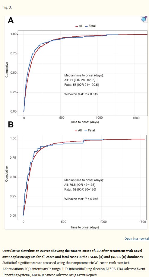 總之,多種用于乳腺癌的新型抗腫瘤藥物,特別是T-DXd、abemaciclib、依維莫司、T-DM1和帕妥珠單抗,顯示出與ILD相關(guān)的不成比例報(bào)告的信號。大多數(shù)藥物的起效時(shí)間在給藥后早期出現(xiàn),致命病例發(fā)生得更早。與傳統(tǒng)化療藥物相比,新型抗腫瘤藥物與ILD的相關(guān)性更強(qiáng)。年齡和體重是影響ILD發(fā)生的潛在因素。這些發(fā)現(xiàn)可以幫助臨床醫(yī)生及時(shí)識(shí)別和管理ILD,從而提高患者的治療持久性和生活質(zhì)量。