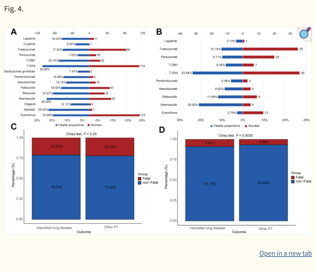 在FAERS中,超過20%的ILD病例有致命的結(jié)局。T-Dxd的死亡率最高(30.89%)(圖4A)。在JADE中,T-Dxd不僅死亡率最高,為23.84%,而且死亡病例數(shù)最高(36/151)(圖4B)。在SMQ水平,大多數(shù)死亡病例歸因于ILD和肺炎,分別占260例(23.55%)和199例(20.49%)。此外,我們在JADER中的分析顯示,與沒有ILD的組(6.58%,409/6219)相比,ILD組的死亡風(fēng)險(xiǎn)(8.82%,134/1519)顯著更高,P = 0.0030(圖4D)。然而,在FAERS中沒有觀察到類似的發(fā)現(xiàn)(ILD:20.97%,535/2551與其他PT:22.05%,16269/73783;P = 0.20)(圖4C)。