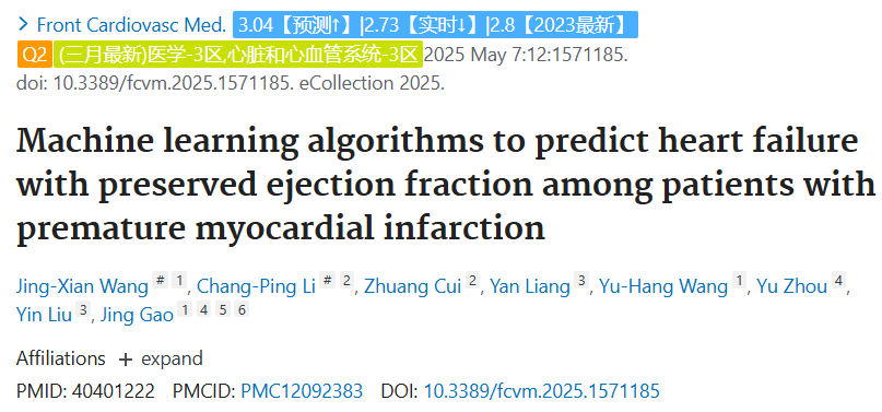 2025年5月7日,Jing-Xian Wang等人在《Front Cardiovasc Med》雜志上發(fā)表了一篇題為《Machine learning algorithms to predict heart failure with preserved ejection fraction among patients with premature myocardial infarction》的文章。 早發(fā)性心肌梗死(PMI)患者射血分?jǐn)?shù)保留的心力衰竭(HFpEF)是影響長期預(yù)后的關(guān)鍵因素。本研究旨在開發(fā)一種基于機(jī)器學(xué)習(xí)算法的模型,該模型可以及早快速預(yù)測PMI患者發(fā)生院內(nèi)HFpEF的風(fēng)險。