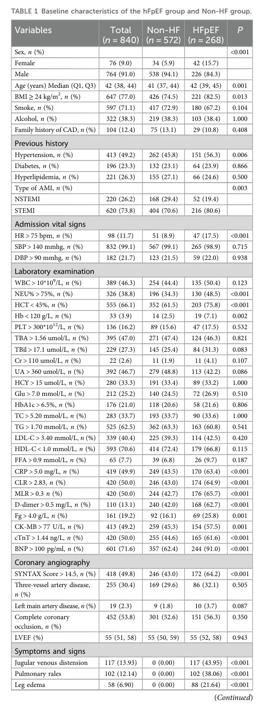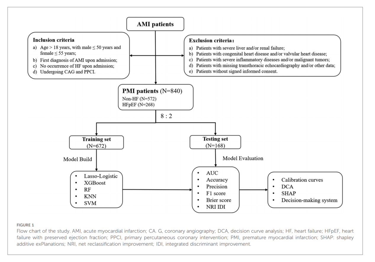 HFpEF在急性心肌梗死(AMI)患者中占比逐年上升,尤其在年輕人群中預(yù)后較差,但其預(yù)測模型研究仍存在空白。因此本研究聚焦于比較不同機(jī)器學(xué)習(xí)模型的性能,篩選關(guān)鍵預(yù)測因子,并構(gòu)建可解釋的臨床決策支持工具,從而為高風(fēng)險患者的個體化干預(yù)提供依據(jù),降低HFpEF發(fā)病率并改善長期預(yù)后。