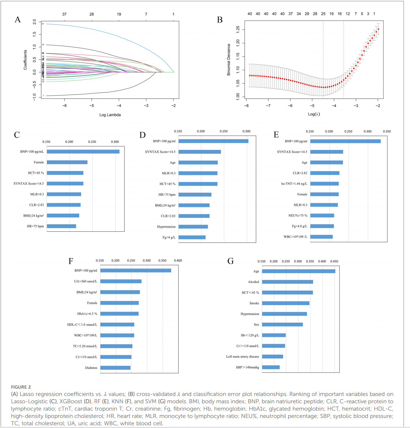 研究將840例患者按8:2比例隨機(jī)劃分為訓(xùn)練集(672例)和測試集(168例),所有預(yù)測變量的方差膨脹因子(VIF)均<5,表明多重共線性問題不顯著?;贚asso回歸的變量篩選(圖2A-B)從全變量集中識別出12個關(guān)鍵預(yù)測因子,包括女性、高血壓、STEMI、BMI≥24 kg/m2、SYNTAX評分>14.5、入院心率(HR)>75次/分、中性粒細(xì)胞百分比(NEU%)>75%、紅細(xì)胞壓積(HCT)<45%、心肌肌鈣蛋白T(cTnT)>1.44 ng/L、MLR>0.3、CLR>2.83及BNP>100 pg/ml。經(jīng)多因素Logistic回歸進(jìn)一步篩選后,最終模型保留8個變量:女性、BMI≥24 kg/m2、SYNTAX評分>14.5、HR>75次/分、HCT<45%、MLR>0.3、CLR>2.83及BNP>100 pg/ml。RF、XGBoost、KNN和SVM模型經(jīng)全變量訓(xùn)練后,基于特征重要性排名選取前10個變量重新建模。各模型的特征重要性排序分別展示于圖2C-G中,其中XGBoost模型的關(guān)鍵變量包括BNP水平、SYNTAX評分、年齡、炎癥比值等(如圖2D)。