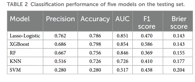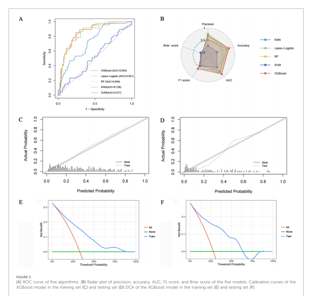 各模型在測試集的分類性能比較如表2及圖3A-B所示。五種機(jī)器學(xué)習(xí)模型的AUC范圍為0.517(SVM)至0.854(XGBoost),其中XGBoost的AUC、準(zhǔn)確率(0.798)及F1分?jǐn)?shù)(0.586)均為最優(yōu),Brier分?jǐn)?shù)(0.143)與Lasso-Logistic相當(dāng)。雷達(dá)圖(圖3B)綜合顯示XGBoost在多數(shù)指標(biāo)上表現(xiàn)突出。補(bǔ)充圖S1表明,SMOTE技術(shù)有效平衡了訓(xùn)練集類別分布,提升XGBoost與KNN的F1分?jǐn)?shù)及AUC,但SVM性能未改善。