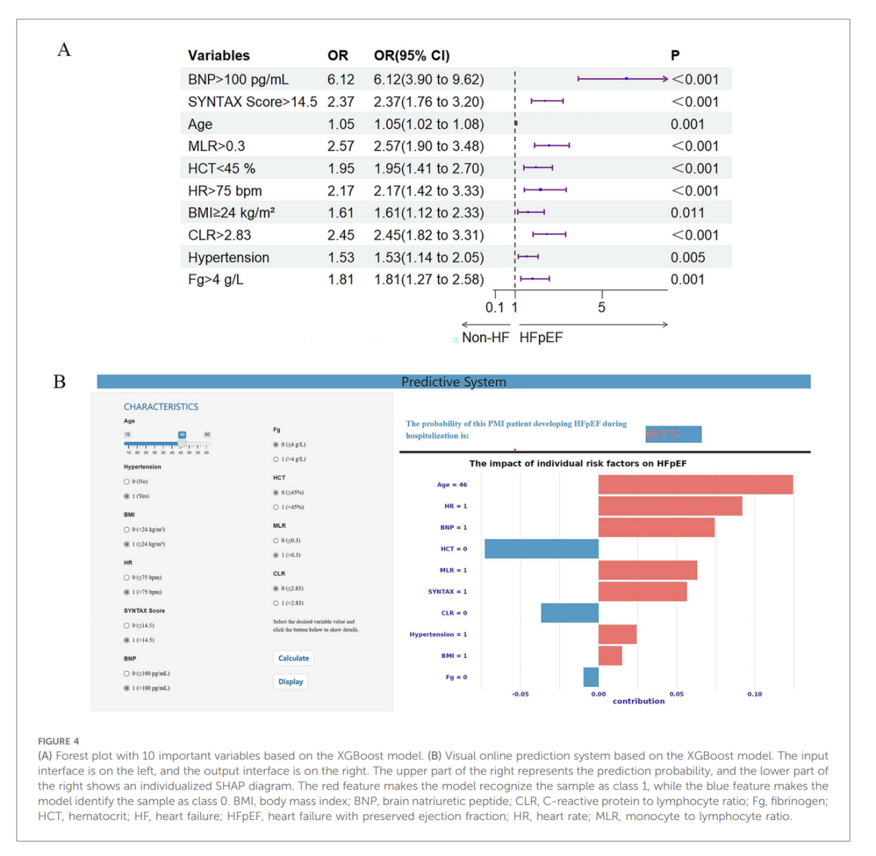 視覺預(yù)測系統(tǒng)包括用于輸入患者變量(例如,年齡、高血壓狀態(tài))的輸入界面(左)和顯示預(yù)測概率(上)和解釋模型決策的個性化SHAP圖(下)的輸出界面(右)。在圖4B中,系統(tǒng)根據(jù)臨床輸入預(yù)測PMI患者發(fā)生HFpEF的概率為65.5%。該系統(tǒng)向公眾開放https://hfpefpmi.shinyapps.io/apppredict/.