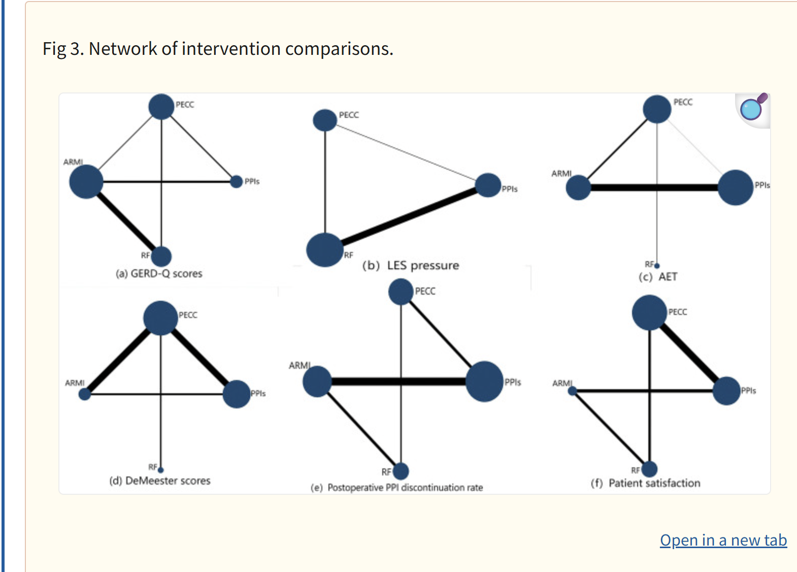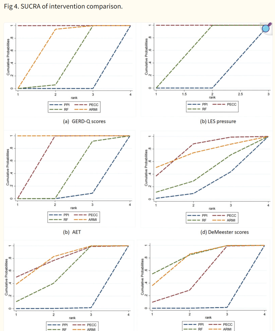 本研究最初比較了三種ECSF手術(shù)在GERD患者中的臨床療效。結(jié)果顯示,PECC在提高術(shù)后GERD-Q評(píng)分、增加LES壓力和PPI停藥率方面顯示出最佳結(jié)果,術(shù)后SAEs的發(fā)生率最低。ARMI在改善食管酸暴露方面最有效??紤]到整體療效和安全性,PECC是最受歡迎的ECSF手術(shù);但是,應(yīng)根據(jù)患者的具體情況選擇最合適的治療方法。