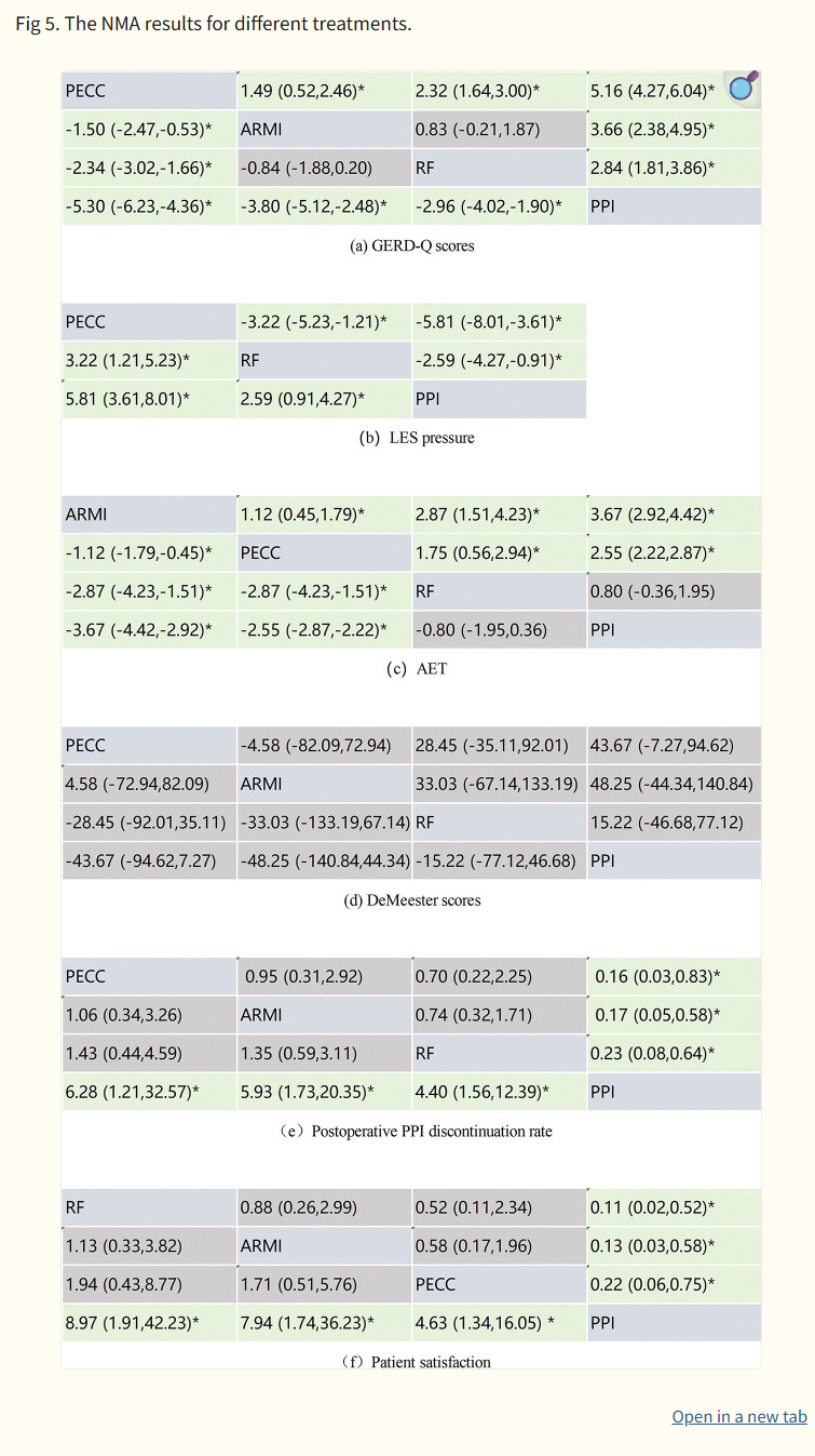每種治療措施的SUCRA為PECC(74.6.0%)、ARMI(70.7%)、RF(36.3%)和PPI(18.0%)(圖4D)。然而,NMA結(jié)果顯示手術(shù)之間沒有統(tǒng)計(jì)學(xué)上的顯著差異(圖5D)。