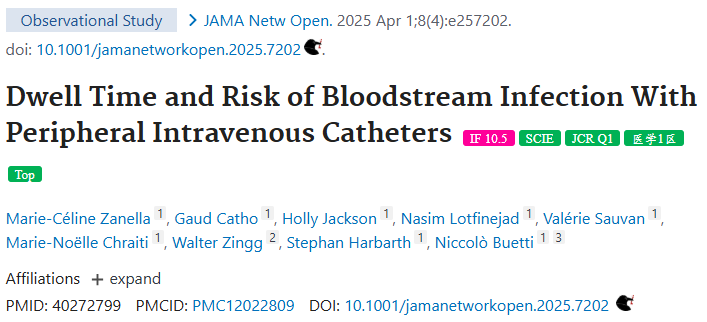 2025年4月,外國學者在《JAMA Netw Open.》(中科院醫(yī)學1區(qū),IF=10.5)發(fā)表標題為:“Dwell Time and Risk of Bloodstream Infection With Peripheral Intravenous Catheters”的研究論文。