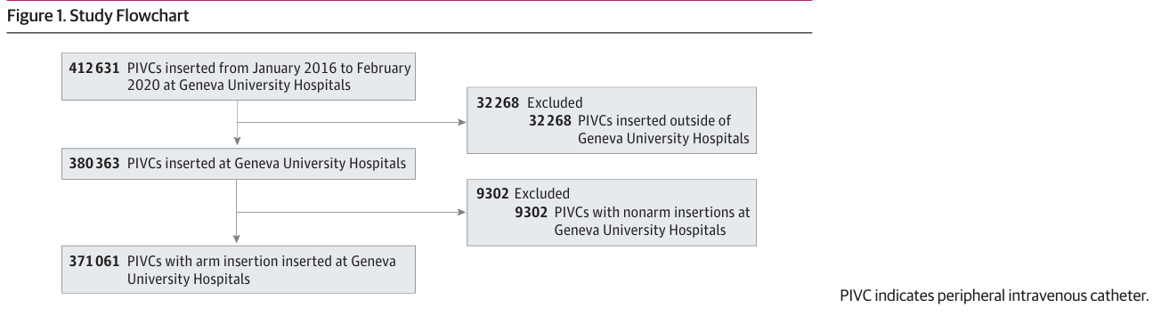 設計、設置和參與者:在這項觀察性隊列研究中,評估了2016年1月1日至2020年2月29日期間在日內瓦大學醫(yī)院住院且上肢至少有1次PIVC插入(N=371061)的患者。統(tǒng)計分析于2023年1月至2025年1月進行。