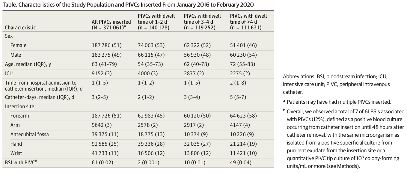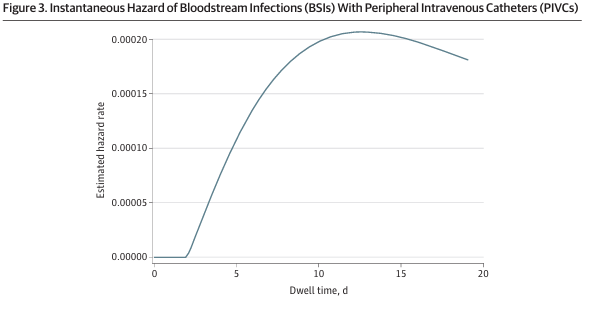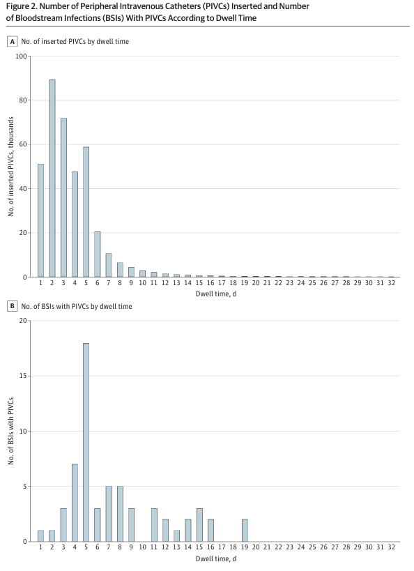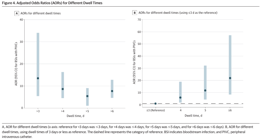 Zanella MC, Catho G, Jackson H, Lotfinejad N, Sauvan V, Chraiti MN, Zingg W, Harbarth S, Buetti N. Dwell Time and Risk of Bloodstream Infection With Peripheral Intravenous Catheters. JAMA Netw Open. 2025 Apr 1;8(4):e257202.