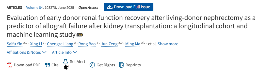 2025年6月3日,Saifu Yin等人在《eClinicalMedicine》雜志上發(fā)表了一篇題為《Evaluation of early donor renal function recovery after living-donor nephrectomy as a predictor of allograft failure after kidney transplantation:a longitudinal cohort and machine learning study》的文章。研究旨在評估活體供腎切除術(shù)后早期供腎功能恢復(fù)情況,并探討其與長期移植結(jié)局的關(guān)系。