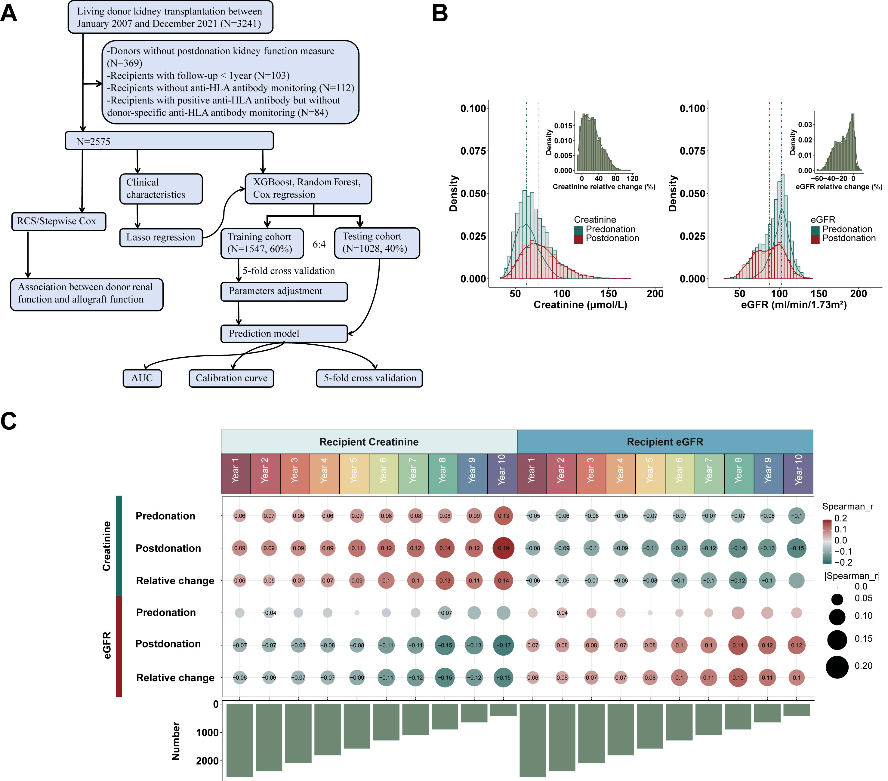 腎移植是終末期腎?。‥SKD)的最佳治療方法,但移植受者仍面臨顯著的長期死亡審查腎移植失?。―CGF)風(fēng)險(xiǎn),10年后失敗率達(dá)20-40%。既往研究主要關(guān)注受者因素(如估算腎小球?yàn)V過率eGFR、蛋白尿、組織學(xué)、HLA抗體譜)和免疫學(xué)參數(shù)預(yù)測DCGF風(fēng)險(xiǎn),其中iBOX評分系統(tǒng)在歐美人群中預(yù)測5年DCGF的準(zhǔn)確性約80%,但其長期預(yù)測能力下降?;铙w供腎切除后,剩余腎臟會通過代償性高濾過發(fā)生功能改變,但不同供體的代償能力存在顯著個(gè)體差異。有研究表明,供者術(shù)后腎功能不全與受者DCGF風(fēng)險(xiǎn)升高相關(guān),且供者術(shù)后發(fā)展為ESRD也與受者移植腎丟失風(fēng)險(xiǎn)增加相關(guān)。然而,目前尚無量化腎臟代償能力的生物標(biāo)志物。因此,本研究旨在評估活體供腎切除后早期供體腎功能恢復(fù)情況(定義為供體肌酐相對變化dCRC),并探討其與受者長期移植預(yù)后的關(guān)系。