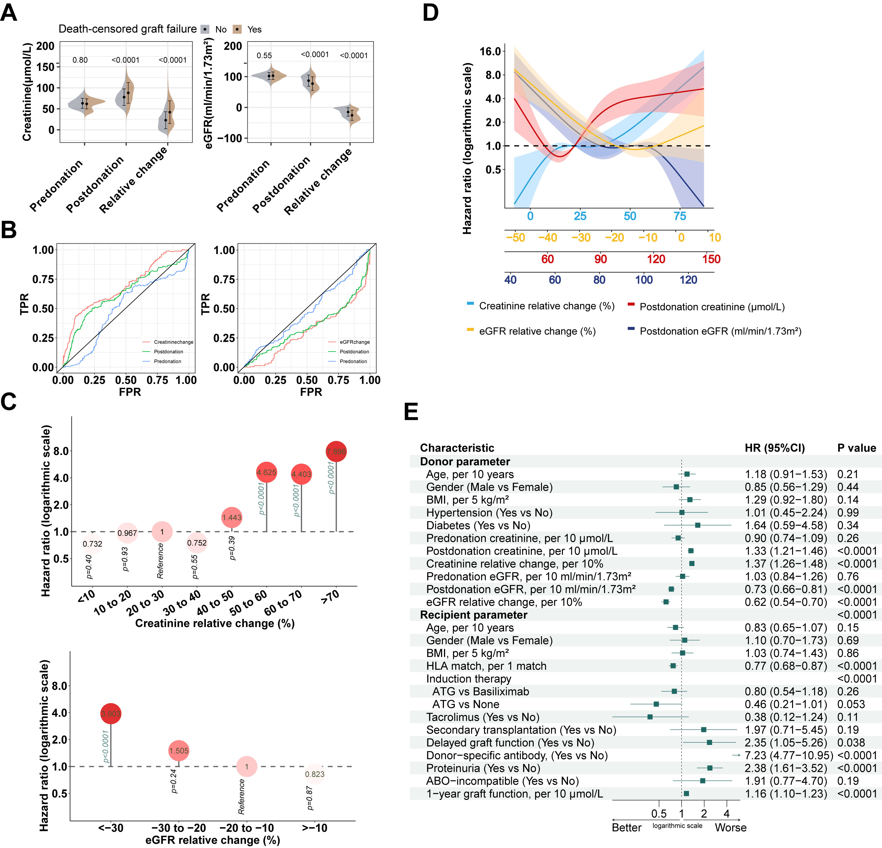 移植后平均隨訪85.5個(gè)月,其中113名(4.4%)接受者出現(xiàn)DCGF。對于經(jīng)歷過DCGF的接受者,其捐贈(zèng)者的捐獻(xiàn)前腎功能與未經(jīng)歷過DCGF的捐贈(zèng)者相似(血清肌酐62.0[54.0–71.0] vs. 65.5[52.0–70.0]μmol/L,P = 0.80;eGFR 102.7[95.1–109.2] vs. 103.3[94.4–110.4] ml/min/1.73 m2,P = 0.55),但捐獻(xiàn)后腎功能明顯較差(肌酐 75.2[63.2–88.8] vs. 91.2[70.2–106.3] μmol/L,P < 0.0001;88.1[73.0–101.0] vs. 72.8[60.1–97.0] ml/min/1.73 m2,eGFR P < 0.0001) 和更高的相對變化 (兩者 P < 0.0001) (圖 2A )。時(shí)間依賴性ROC分析顯示,與捐獻(xiàn)前肌酐相比,dCRC在預(yù)測受體移植失敗方面具有更高的AUC值 (AUC:0.689 vs. 0.504,P = 0.0082,圖 2B )。為了探索劑量反應(yīng)關(guān)系,我們以 20%–30% 為參考將dCRC分為7組,發(fā)現(xiàn)較高的dCRC與DCGF風(fēng)險(xiǎn)增加相關(guān) (圖 2C )。限制性三次樣條分析顯示DCGF與捐獻(xiàn)后腎功能和dCRC之間呈J形關(guān)聯(lián) (圖 2D)。調(diào)整混雜因素后(補(bǔ)充圖 S2),dCRC每增加 10%,DCGF風(fēng)險(xiǎn)就會增加36.7%(HR:1.367,95% CI:1.262-1.479,P < 0.0001)(圖 2E)。
