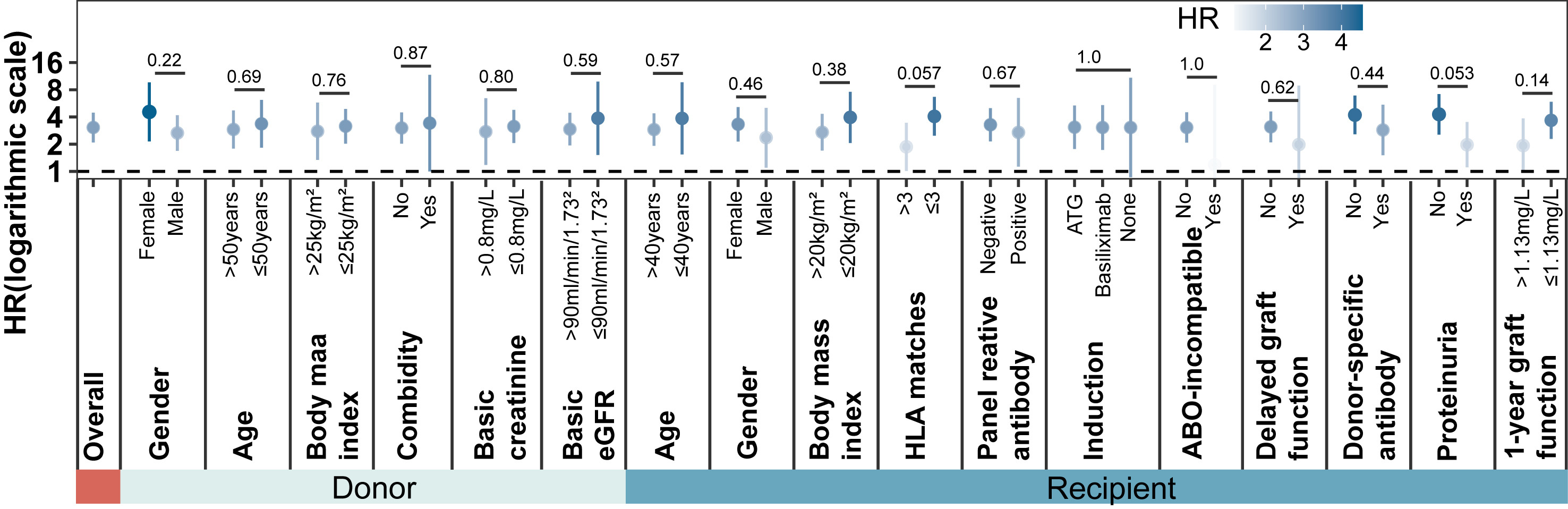 乘積交互作用分析在不同亞組中獲得了一致的結(jié)果(圖3)。具體而言,這種關(guān)聯(lián)在捐獻(xiàn)前eGFR(<90 vs. ≥90 mL/min/1.73 m2,P = 0.59)中持續(xù)存在。