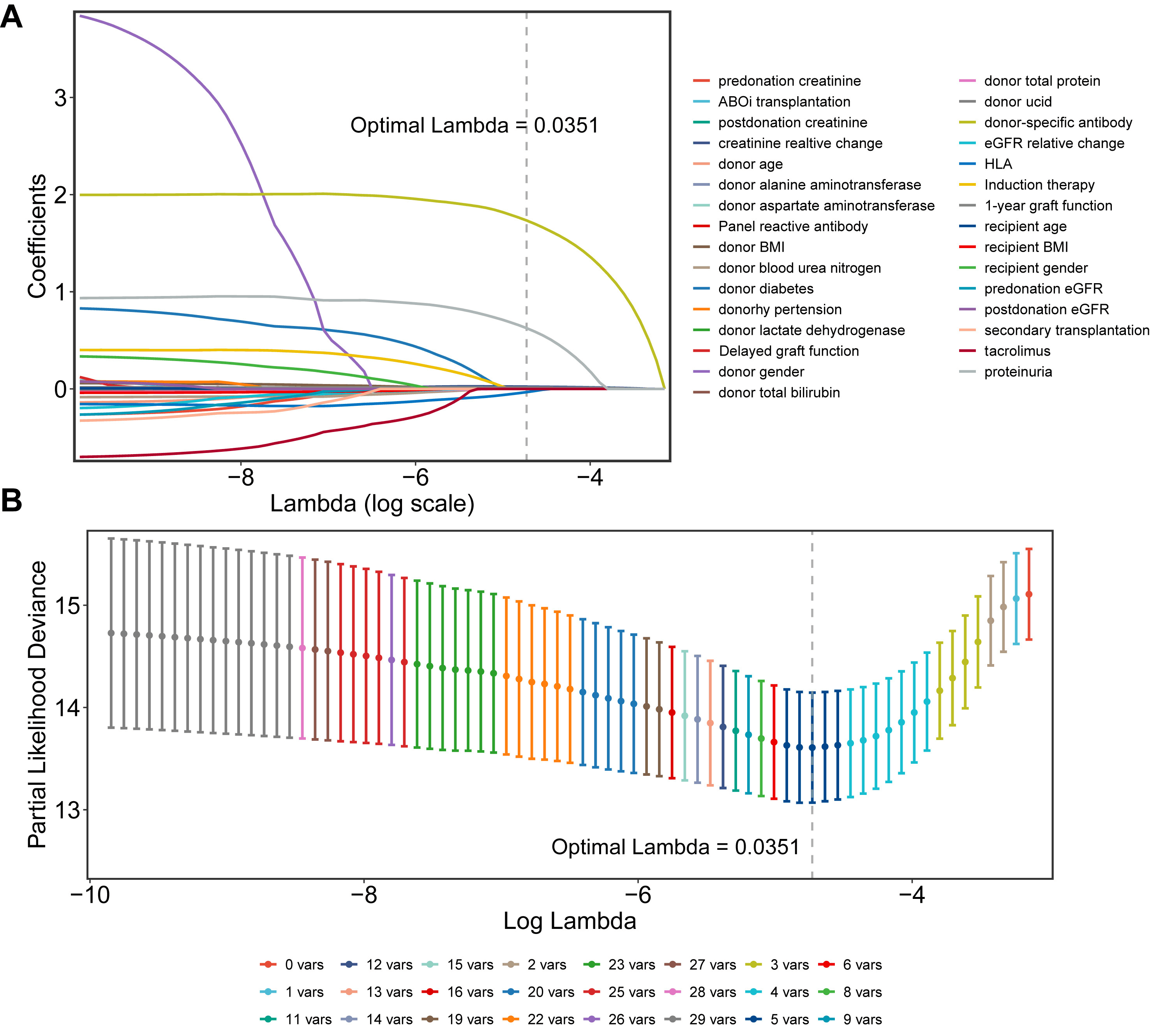 本研究是一項(xiàng)單中心、回顧性、縱向隊(duì)列研究,并結(jié)合了機(jī)器學(xué)習(xí)分析。研究暴露因素是供體早期腎功能恢復(fù),定義為供體肌酐相對變化(dCRC)。供腎后腎功能數(shù)據(jù)采集時(shí)間為術(shù)后3至12個(gè)月之間。主要結(jié)局是DCGF。隨訪時(shí)間起點(diǎn)為移植手術(shù)日期,終點(diǎn)事件為DCGF、受者死亡或研究結(jié)束時(shí)間(2024年6月30日)。研究從電子病歷中提取了10年DCGF風(fēng)險(xiǎn)信息。此外,研究評估了iBOX評分的預(yù)測價(jià)值,并探討加入dCRC后是否能提升預(yù)測性能。對缺失的BMI數(shù)據(jù)(供體缺失率5.3%,受體缺失率3.6%)使用鏈?zhǔn)椒匠踢M(jìn)行多重插補(bǔ)。