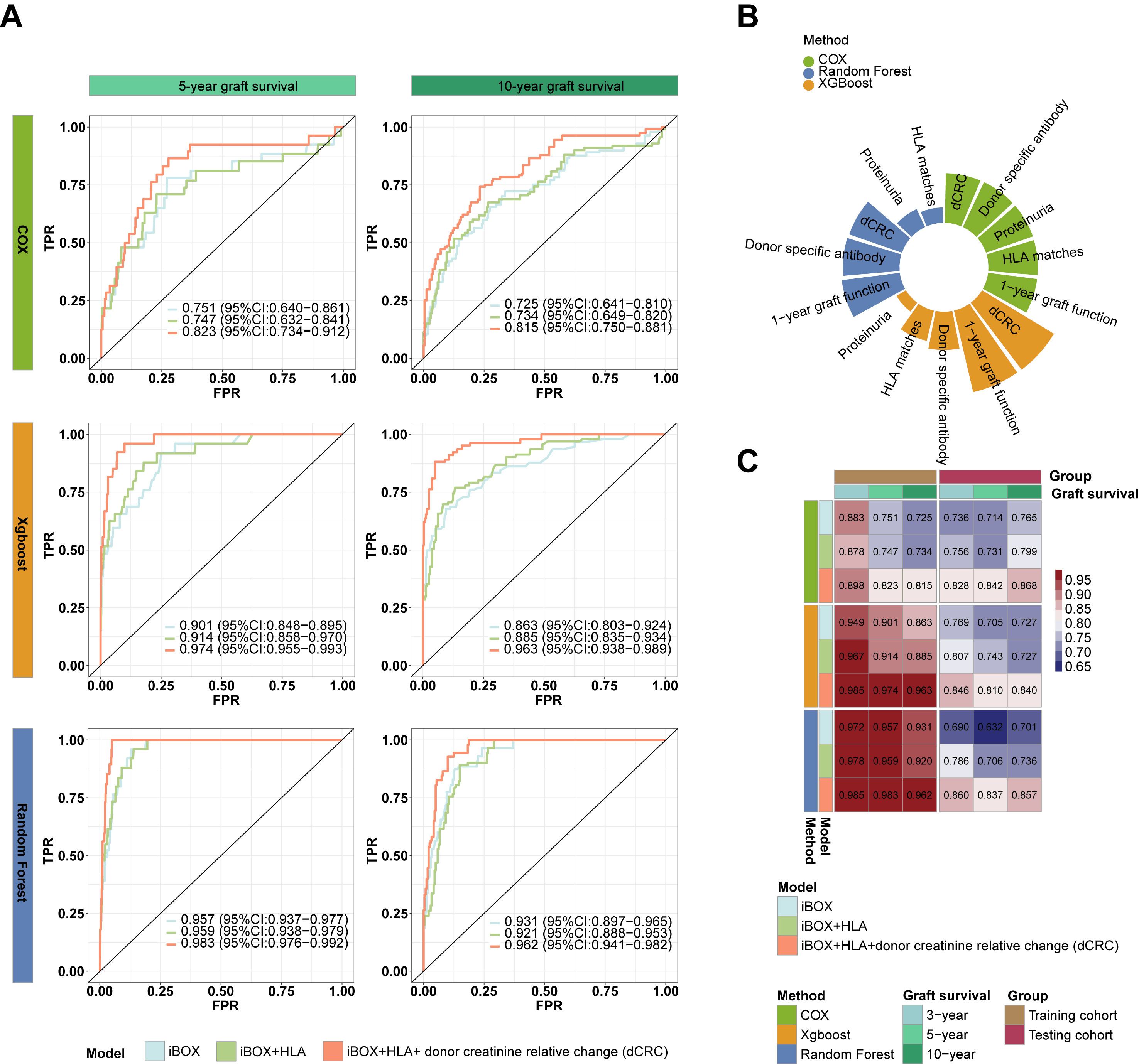 LASSO回歸后,根據(jù)最小λ值選擇了5個(gè)特征(圖 4)。逐步Cox分析也確定了相同的5個(gè)具有最小AIC值的預(yù)測因子。我們將隊(duì)列隨機(jī)分為訓(xùn)練集(60%,N = 1547)和測試集(40%,N = 1028)。進(jìn)行了多變量Cox回歸、XGBoost和隨機(jī)森林分析。經(jīng)過超參數(shù)調(diào)整后,與訓(xùn)練隊(duì)列中的模型2和模型1相比,模型3對10年移植物存活率表現(xiàn)出更好的鑒別力(圖 5 A)。在測試隊(duì)列中,模型3對10年移植物存活率表現(xiàn)出優(yōu)異的鑒別力,在Cox、XGBoost 和隨機(jī)森林模型中的AUC值分別為0.868、0.840和0.857(圖 5 C)。