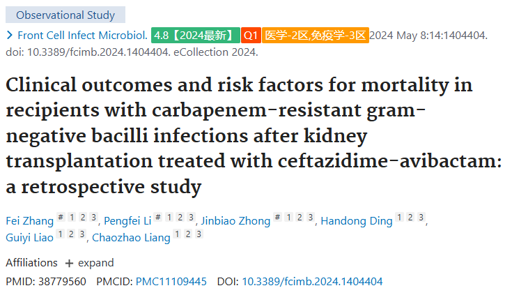 2024年5月8日,在《Frontiers in cellular and infection microbiology》上發(fā)表一篇名為“Clinical outcomes and risk factors for mortality in recipients with carbapenem-resistant gram-negative bacilli infections after kidney transplantation treated with ceftazidime-avibactam: a retrospective study”的研究論文,本研究旨在評估腎移植(KT)受者頭孢他啶-阿維巴坦(CAZ-AVI)治療失敗相關(guān)的危險因素以及是否需要基于CAZ-AVI的聯(lián)合治療。
