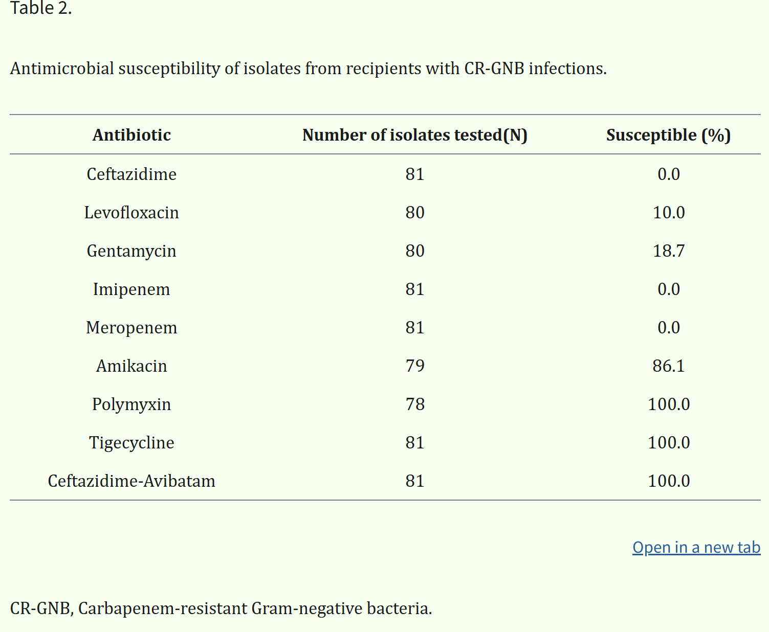 隨著近年來碳青霉烯類抗生素的廣泛使用,耐碳青霉烯類抗生素的革蘭陰性桿菌(CR-GNB),主要是耐碳青霉烯類腸桿菌科(CRE)、耐碳青霉烯類銅綠假單胞菌(CRPA)和耐碳青霉烯類鮑曼不動桿菌(CRAB)的檢出率有所增加。由于嚴(yán)重的手術(shù)創(chuàng)傷和免疫功能受損等因素,腎移植(KT)受者特別容易受到CR-GNB感染。由于治療選擇有限,這些感染通常與高臨床失敗率、發(fā)病率和死亡率有關(guān)。在中國,用于治療這些難治性分離株引起的感染的主要抗生素是氨基糖苷類、多粘菌素和替加環(huán)素。然而,對其臨床療效、安全性和新出現(xiàn)的耐藥性的擔(dān)憂限制了它們的臨床使用。特別是上述藥物大多具有腎毒性,考慮到對移植腎功能的保護(hù),這些藥物在KT受者中的使用進(jìn)一步受到限制。臨床上,KT后CR-GNB感染的治療選擇很少,迫切需要針對這些難治性病原體的新治療方法。
