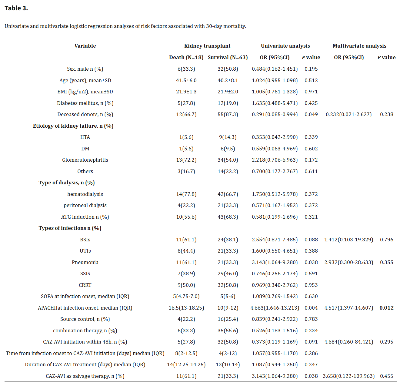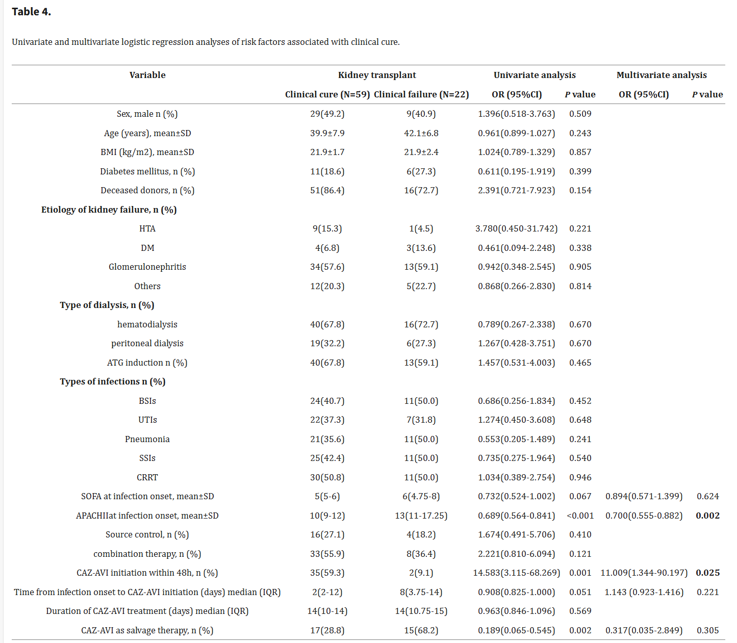 本研究確定了接受CAZ-AVI治療的CR-GNB感染KT受試者臨床失敗和30天死亡率的危險因素,我們的研究表明,CAZ-AVI在CR-GNB感染的KT受試者的生存和臨床反應(yīng)方面提供臨床益處,即使作為單一療法。較高的APACHE II評分與30天死亡率和臨床失敗相關(guān),感染發(fā)作后48小時內(nèi)及時給予CAZ-AVI與臨床治愈呈正相關(guān)。這些發(fā)現(xiàn)可能有助于臨床醫(yī)生使用CAZ-AVI優(yōu)化CR-GNB感染的KT受試者的治療策略,并降低未來的死亡率。