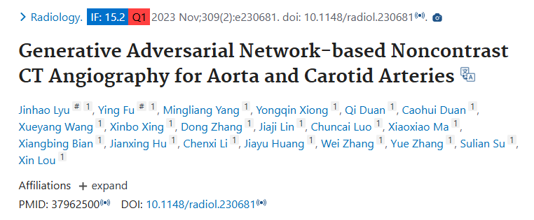 Lyu J, Fu Y, Yang M, Xiong Y, Duan Q, Duan C, Wang X, Xing X, Zhang D, Lin J, Luo C, Ma X, Bian X, Hu J, Li C, Huang J, Zhang W, Zhang Y, Su S, Lou X. Generative Adversarial Network-based Noncontrast CT Angiography for Aorta and Carotid Arteries. Radiology. 2023 Nov;309(2):e230681. doi: 10.1148/radiol.230681IF: 15.2 Q1 . PMID: 37962500.