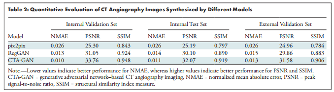 結(jié)果:內(nèi)部測試集Syn-CTA與真實CTA高度相似(NMAE=0.011, PSNR=32.07 dB, SSIM=0.919),顯著優(yōu)于對照模型。外部驗證集性能穩(wěn)定(NMAE=0.013, PSNR=31.58 dB, SSIM=0.906)。