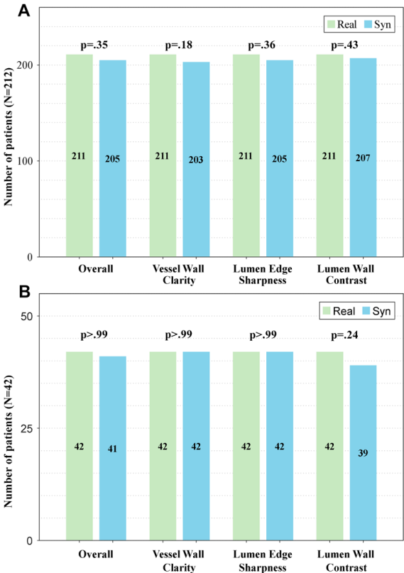 核心結(jié)論:95%的Syn-CTA圖像獲評"優(yōu)質(zhì)"(評分=3),與真實CTA無統(tǒng)計學差異(P=0.35)。