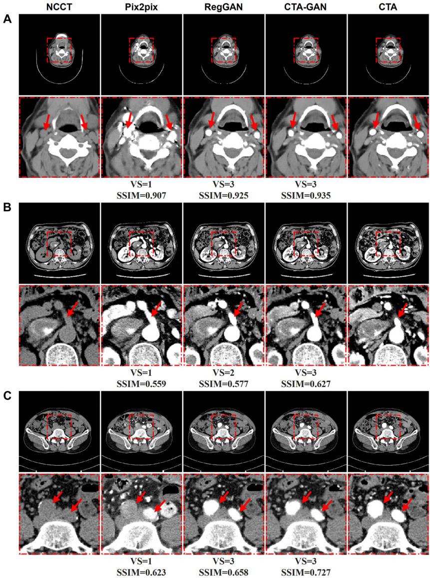 目標:開發(fā)一種基于生成對抗網(wǎng)絡(luò)(GAN)的無碘對比劑(ICA)CT血管成像(CTA)模型(CTA-GAN),通過平掃CT(NCCT)生成合成CTA圖像(Syn-CTA),并評估其在頸部和腹部血管疾病診斷中的圖像質(zhì)量及準確性。避免碘對比劑帶來的過敏反應(yīng)、腎功能損傷等風險,降低檢查成本和時間。
