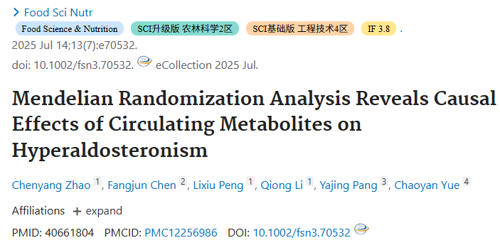 2025年7月14日,《Food Sci Nutr》刊登了一項(xiàng)中國學(xué)者的孟德爾隨機(jī)化(MR)研究論文,探討了血液代謝產(chǎn)物與原發(fā)性醛固酮增多癥發(fā)展的因果關(guān)系。該研究通過MR方法,為血液代謝產(chǎn)物在原發(fā)性醛固酮增多癥發(fā)展中的潛在作用提供了提示性證據(jù),揭示了其在早期檢測和治療策略中的新見解。