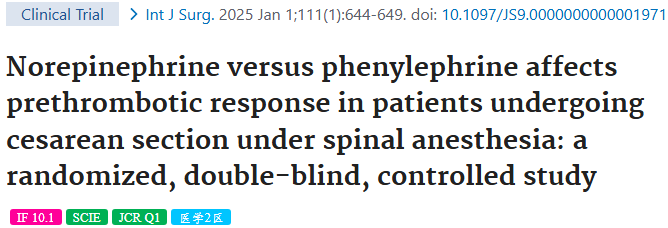 2024年7月,中國學(xué)者在《International Journal of Surgery》(中科院醫(yī)學(xué)2區(qū),IF=10.1)發(fā)表標(biāo)題為:“Norepinephrine versus phenylephrine affects prethrombotic response in patients undergoing cesarean section under spinal anesthesia: a randomized, double-blind, controlled study”的研究論文。