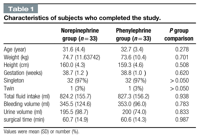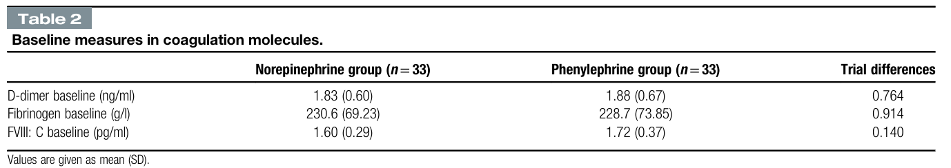 材料與方法:66名在脊麻下行剖宮產(chǎn)的婦女被隨機(jī)分配至NE組或PHE組,自蛛網(wǎng)膜下腔給藥開始,以15 ml/h的恒定速率靜脈泵注含有NE或PHE的“研究藥物”溶液,直至手術(shù)結(jié)束。在手術(shù)入室時(shí)及手術(shù)結(jié)束時(shí)采集血液樣本,測量血漿凝血因子VIII活性(FVIII:C)、纖維蛋白原和D-二聚體水平。