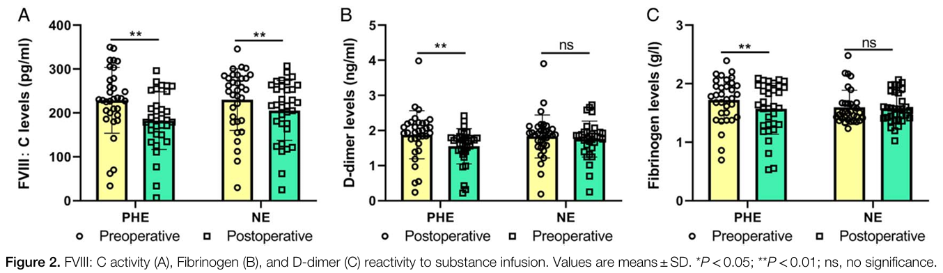 結(jié)果:與術(shù)前水平相比,NE組術(shù)后纖維蛋白原和D-二聚體水平無顯著差異,僅FVIII: C水平降低(P=0.003)。然而,與PHE組術(shù)后水平相比,NE組術(shù)后FVIII: C(P=0.009)、纖維蛋白原(P=0.035)和D-二聚體(P=0.025)水平均升高。
