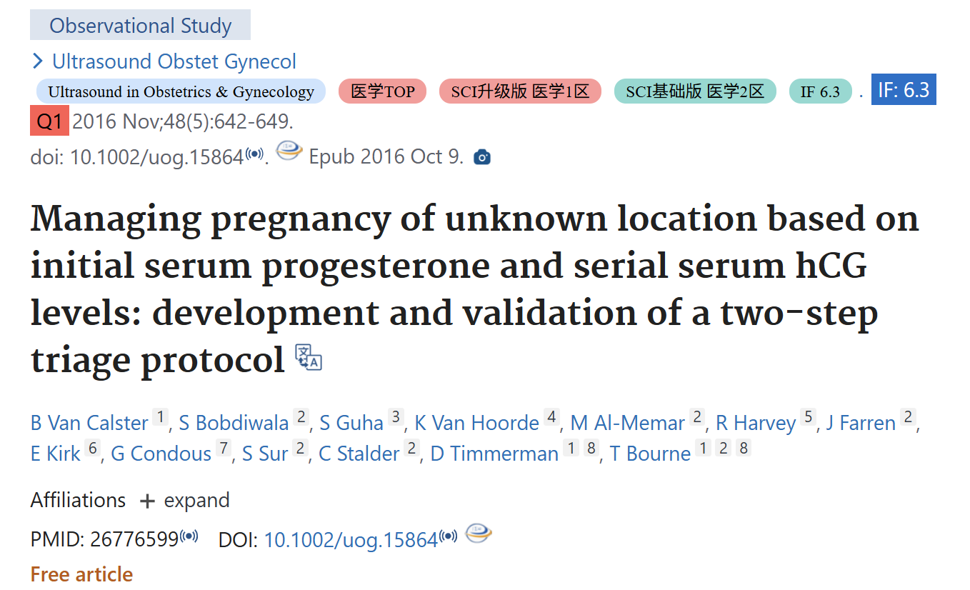 2016年10月9日,在《Ultrasound in Obstetrics & Gynecology》上一篇名為“Managing pregnancy of unknown location based on initial serum progesterone and serial serum hCG levels: development and validation of a two-step triage protocol”的研究論文被發(fā)表,本研究旨在使用更大的未知位置妊娠(PUL)隊(duì)列開發(fā)一種結(jié)合初始血清黃體酮水平和人絨毛膜促性腺激素(hCG)比率的新型兩步方案,只需一次就診即可排出一些PUL。