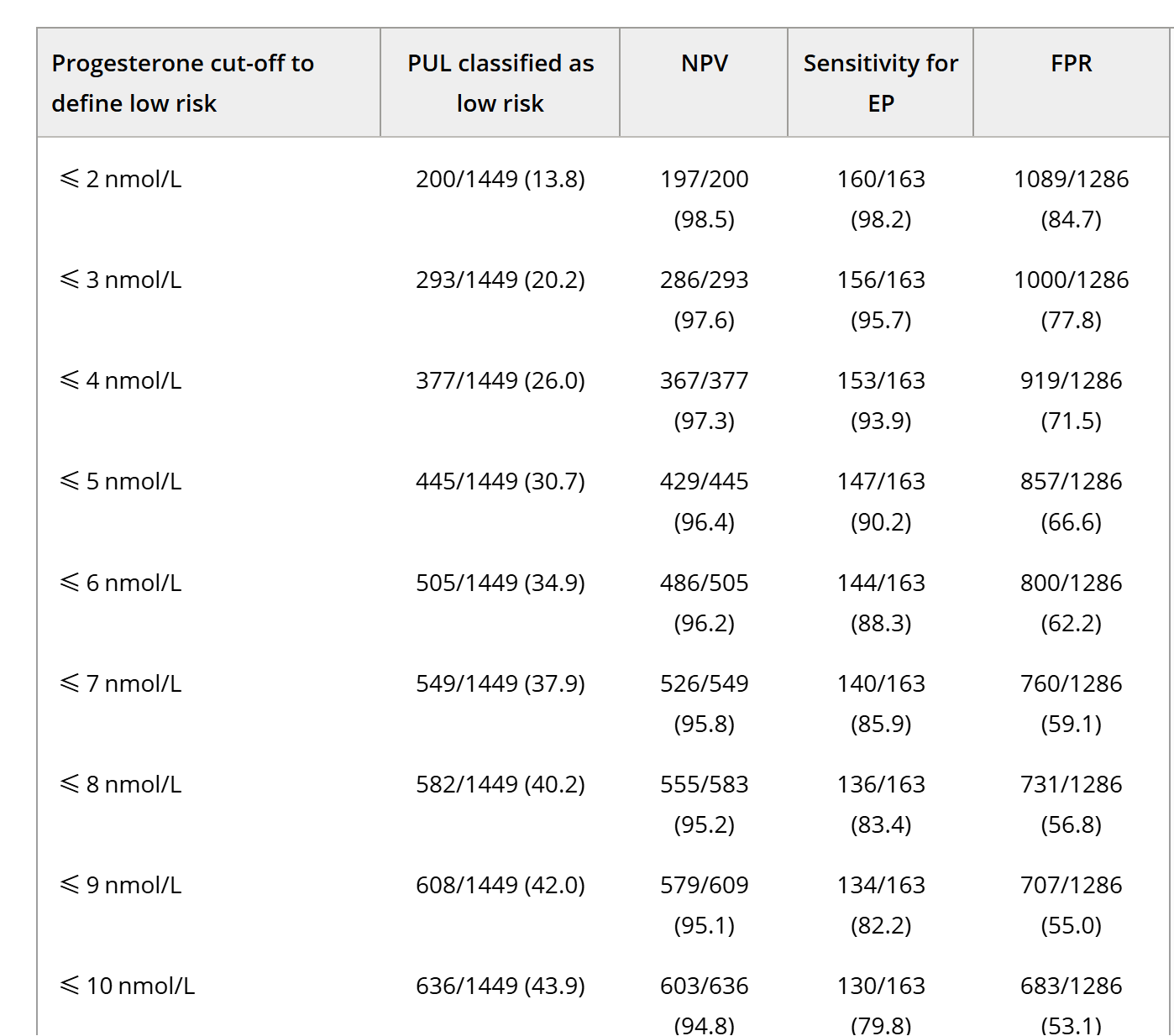 第一步,基于發(fā)育數(shù)據(jù)中初始黃體酮臨界值范圍為≤2至≤10nmol/L的性能,我們將低風(fēng)險(xiǎn)定義為血清黃體酮水平為≤2nmol/L。