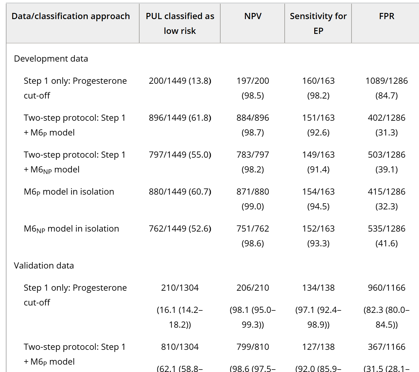 PUL的管理可能時(shí)間過長且成本高昂,并且缺乏一致性。血清生物標(biāo)志物人絨毛膜促性腺激素(hCG)和/或黃體酮用于指導(dǎo)管理。PUL預(yù)測現(xiàn)在側(cè)重于將PUL分類為并發(fā)癥的低風(fēng)險(xiǎn)或高風(fēng)險(xiǎn)。低風(fēng)險(xiǎn)意味著最終結(jié)果是宮內(nèi)妊娠(IUP)或失敗PUL(FPUL),高風(fēng)險(xiǎn)最終結(jié)果是宮外孕(EP)或持續(xù)性PUL(PPUL)。風(fēng)險(xiǎn)分層可以合理化資源,以便患有低風(fēng)險(xiǎn)PUL的女性避免不必要的額外血液檢查、去醫(yī)院就診和超聲波掃描,同時(shí)將資源集中在潛在危及生命的EP風(fēng)險(xiǎn)更大的高風(fēng)險(xiǎn)PUL上。為了使這種資源精簡安全,用于確定風(fēng)險(xiǎn)的分類工具必須準(zhǔn)確,特別是在EP分類方面。不可避免地,一些EP會(huì)被錯(cuò)誤地歸類為低風(fēng)險(xiǎn),但許多EP可能會(huì)在沒有傷害的情況下解決,特別是如果它們與初始黃體酮低或hCG水平下降有關(guān)。為避免不必要的就診和血液檢查,用于管理PUL的血清激素水平的解釋需要標(biāo)準(zhǔn)化。我們之前發(fā)表的M4模型是在相對較少的PUL上開發(fā)的,至少需要兩次訪問。本研究的目的是使用更大的PUL隊(duì)列開發(fā)一種結(jié)合初始血清黃體酮水平和hCG比率的新型兩步方案,只需一次就診即可排出一些PUL。