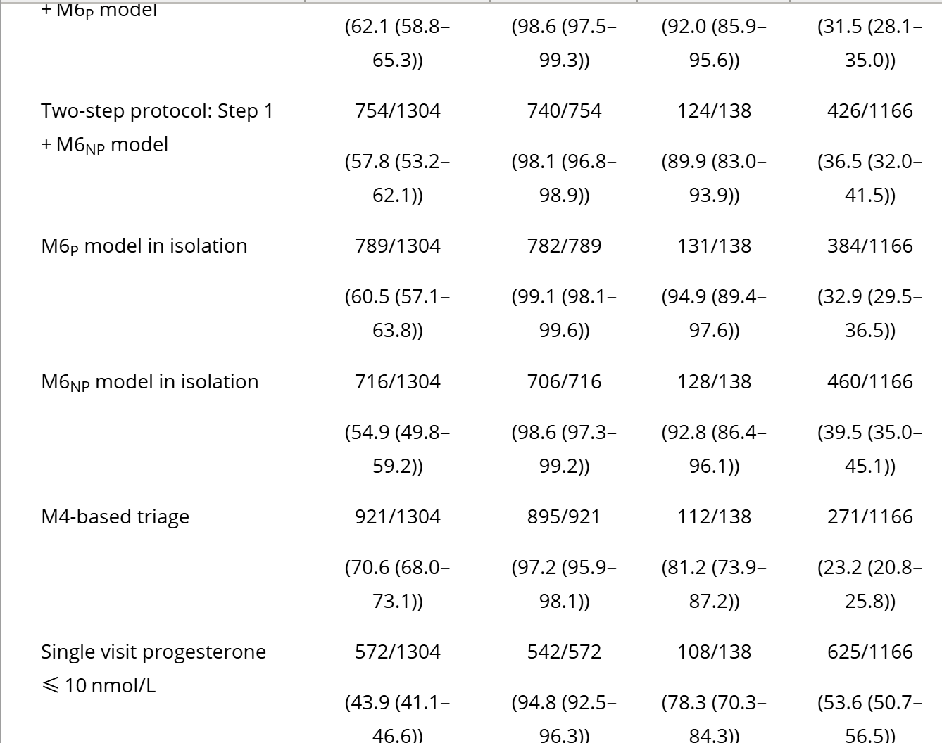 選定的黃體酮臨界值(≤2nmol/L定義低風(fēng)險(xiǎn))將210/1304(16.1%)患者在初次就診時(shí)歸類為低風(fēng)險(xiǎn)。在這210例病例中,有206例最終結(jié)果證實(shí)它們不是EP(即FPUL或IUP;凈現(xiàn)值98.1%)。138個(gè)EP中有4個(gè)被歸類為低風(fēng)險(xiǎn),靈敏度為97.1%(134/138)。最后,當(dāng)僅應(yīng)用第1步時(shí),960/1166FPUL和IUP被歸類為高風(fēng)險(xiǎn)(FPR,82.3%)。