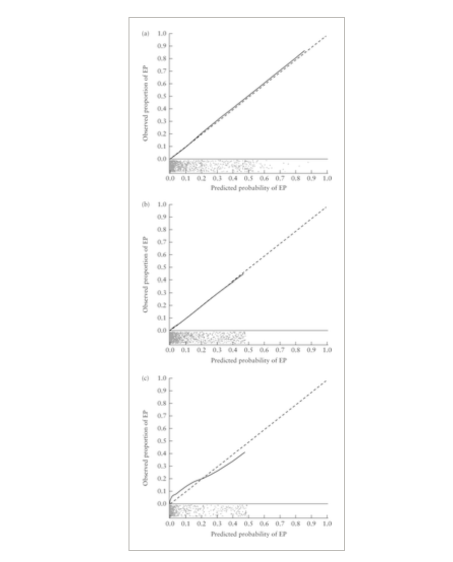 單獨(dú)應(yīng)用M6P模型(即不包含第一步流程)時(shí),將60.5%PUL(789/1304)歸類為低風(fēng)險(xiǎn),NPV為99.1%(782/789),EP敏感性為94.9%(131/138)(即7個(gè)EP被錯(cuò)誤分類為低風(fēng)險(xiǎn)),F(xiàn)PR為32.9%(384/1166)(表3)。預(yù)測EP與其他PUL的AUC為0.903(95%CI,0.880–0.922)。M6NP模型將54.9%的PUL歸類為低風(fēng)險(xiǎn),NPV為98.6%,敏感性為92.8%(128/138),F(xiàn)PR為39.5%。EP與其他PUL的AUC為0.870(95%CI,0.837–0.897)。M6給出的EP估計(jì)風(fēng)險(xiǎn)P和M6NP的模型如校準(zhǔn)圖所示,即使分別對兩個(gè)中心進(jìn)行評估結(jié)果依然如此。
