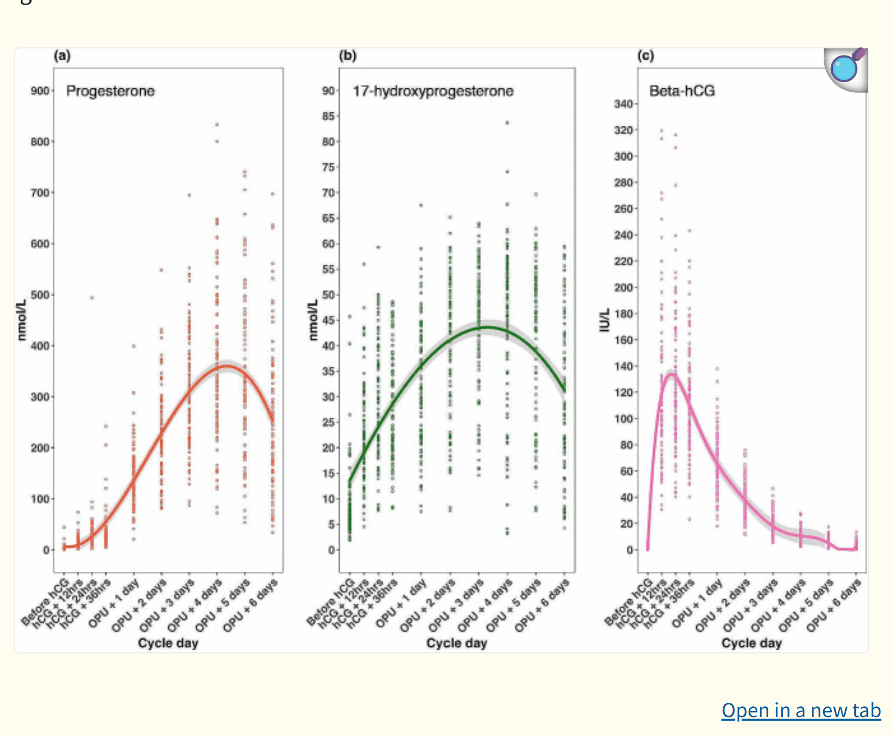 血清黃體酮和17-羥孕酮水平在hCG給藥后的第二天開(kāi)始升高,在卵母細(xì)胞拾取后四天達(dá)到峰值(分別為366±16nmol/L和44±1.6nmol/L),然后開(kāi)始下降。最高血清hCG水平為126mIU/mL,在hCG觸發(fā)后24小時(shí)觀察到,隨后逐漸下降(圖1)。
