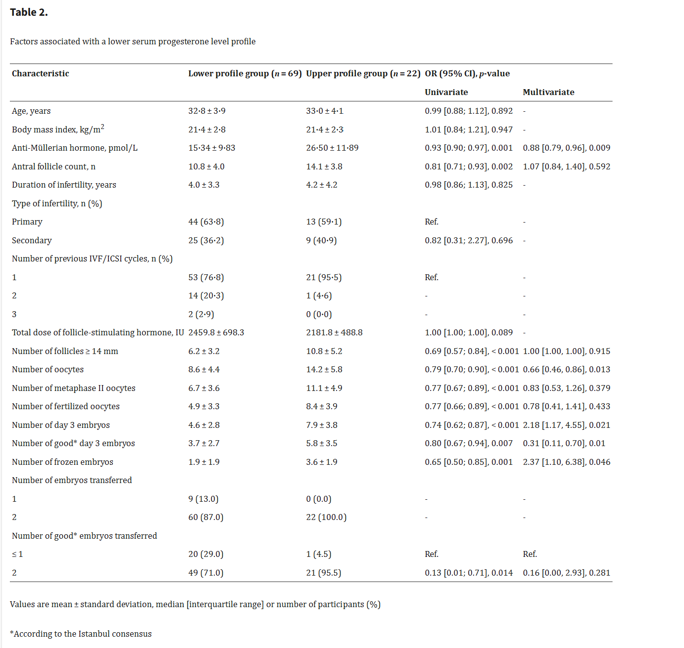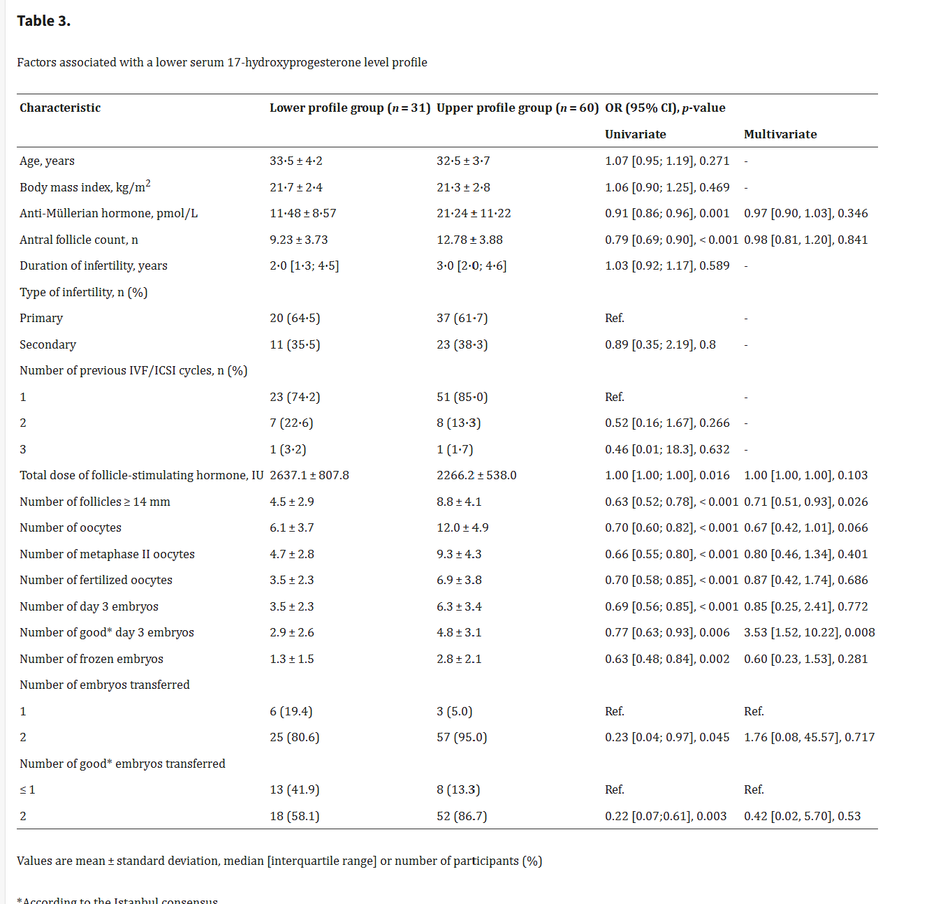 在多變量分析中,與較低黃體酮譜相關(guān)的因素是抗苗勒管激素水平、卵母細(xì)胞數(shù)量、第3天胚胎數(shù)量和第3天良好胚胎數(shù)量(表2)。在多變量分析中,與較低的17-羥孕酮譜相關(guān)的因素是≥14毫米的卵泡數(shù)量和良好的第3天胚胎數(shù)量(表3)。對(duì)于血清黃體酮和17-羥孕酮,在單變量分析中,移植的第3天良好胚胎的數(shù)量與較低的激素譜顯著相關(guān),但與多變量分析無(wú)關(guān)(表2和表3)。