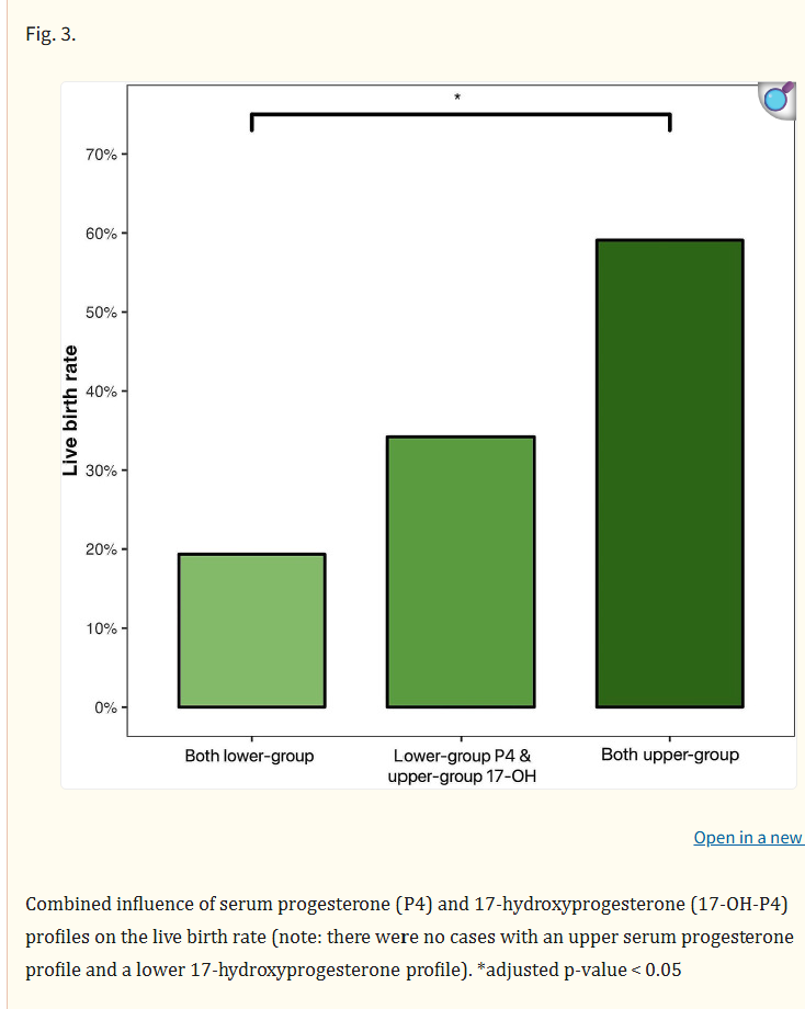 血清黃體酮和血清17-羥孕酮水平較低的個(gè)體活產(chǎn)率最低(6/31,19.4%),兩種激素水平較高的個(gè)體活產(chǎn)率最高(13/22,59.1%);血清黃體酮水平較低且17-羥孕酮較高的女性活產(chǎn)率中等,并且沒(méi)有參與者的17-羥孕酮/較高黃體酮水平較低(圖3)。