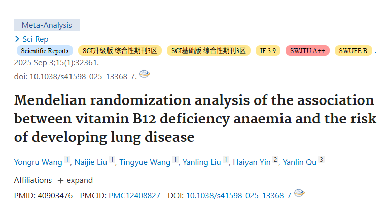 2025年9月3日,中國學(xué)者在《Sci Rep》發(fā)表一項(xiàng)孟德爾隨機(jī)化(MR)研究,結(jié)合貝葉斯加權(quán)法,探討維生素B12缺乏性貧血與肺部疾病(肺纖維化[PF]、特發(fā)性肺纖維化[IPF]、嗜酸性粒細(xì)胞性哮喘[EA]、肺鱗狀細(xì)胞癌[LUSC]、慢性阻塞性肺疾病[COPD]及肺栓塞[PE])之間的因果關(guān)系。