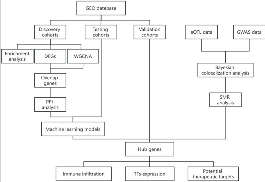 通過對(duì)發(fā)現(xiàn)隊(duì)列進(jìn)行比較表達(dá)譜分析,檢測(cè)到了與IBD相關(guān)的差異表達(dá)基因(DEG)。隨后使用PPI分析確定核心候選基因的優(yōu)先順序,并通過機(jī)器學(xué)習(xí)方法進(jìn)一步細(xì)化。通過CIBERSORTx反卷積算法進(jìn)行免疫細(xì)胞豐度量化和與IBD相關(guān)轉(zhuǎn)錄本的統(tǒng)計(jì)相關(guān)性分析。為了補(bǔ)充這些結(jié)果,將來自GTExv8.ALL.Whole_Blood的血液表達(dá)數(shù)量性狀位點(diǎn)(eQTL)數(shù)據(jù)與來自FinnGen聯(lián)盟的IBD全基因組關(guān)聯(lián)統(tǒng)計(jì)數(shù)據(jù)整合在一起。該多組學(xué)整合框架采用:(1)貝葉斯共定位來評(píng)估共享的因果變異,(2)HEIDI異質(zhì)性檢驗(yàn),以及(3)匯總孟德爾隨機(jī)化(SMR)來驗(yàn)證因果推斷。