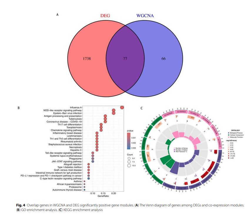 比較WGCNA和DEG顯著陽性基因模塊,得到這些已鑒定模塊的交集。隨后,對(duì)交集基因進(jìn)行富集分析。GO富集分析表明,77個(gè)基因與生物膜高度相關(guān)。KEGG富集分析發(fā)現(xiàn),77個(gè)基因主要與甲型流感病毒和EB病毒感染相關(guān)。