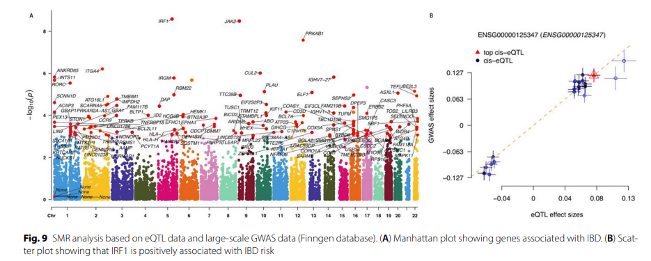 已鑒定出多個(gè)與IBD相關(guān)的潛在基因,包括IRF1、GBP5和PARP9?;趀QTL數(shù)據(jù)的SMR分析顯示,IRF1與IBD風(fēng)險(xiǎn)顯著相關(guān)。需要進(jìn)一步開展功能研究以闡明相關(guān)機(jī)制,這將有助于推動(dòng)IBD靶向分子治療和免疫療法的發(fā)展。