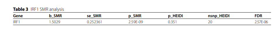 為了探究與遺傳變異相關(guān)的基因生物標(biāo)志物的潛力,基于eQTL數(shù)據(jù)和大規(guī)模GWAS數(shù)據(jù)進(jìn)行了SMR分析,隨后進(jìn)行了HEIDI分析。經(jīng)過Bonferroni校正和共定位分析,發(fā)現(xiàn)133個(gè)基因與IBD風(fēng)險(xiǎn)相關(guān)。其中,IRF1也是IBD的核心基因。最終發(fā)現(xiàn),較高的IRF1可能對(duì)應(yīng)于IBD風(fēng)險(xiǎn)的增加。