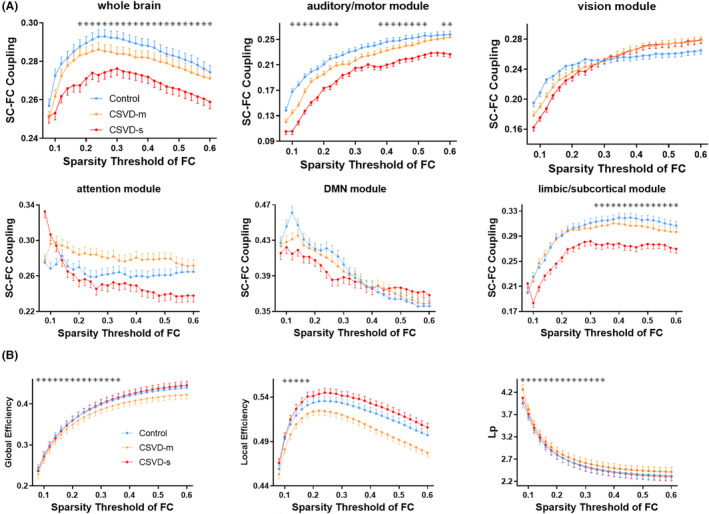 全腦和各功能模塊內的 SC-FC 耦合在組間表現(xiàn)出不同的模式。簡而言之,與對照組相比,在 FC 的廣泛稀疏閾值范圍內,CSVD-s 組在整個大腦、感覺/運動和邊緣/皮質下功能模塊內的 SC-FC 耦合顯著降低。在 CSVD-s 組的這些模塊中,SC-FC 偶聯(lián)的 AUC 值也顯著降低,表明不同稀疏閾值之間顯著變化的一致性和魯棒性。此外,與 CSVD-m 組相比,CSVD-s 組的邊緣/皮質下模塊的 SC-FC 耦合也顯著降低,而 CSVD-m 組和對照組的 SC-FC 耦合沒有差異。