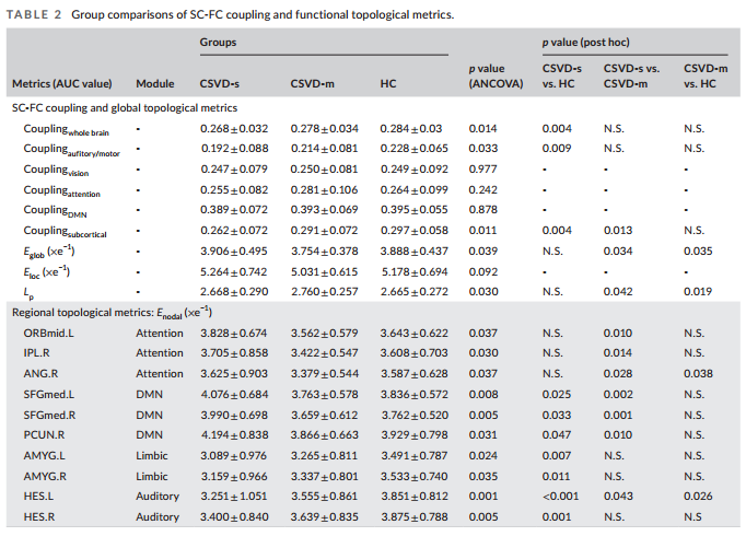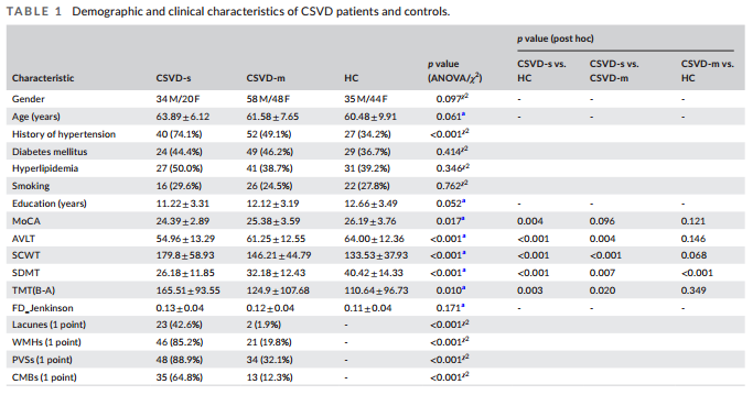 P:共納入了 54 名患有嚴重 CSVD 負荷(CSVD‐s;年齡:63.89 ± 6.12 歲;34 名男性)和 106 名患有輕度 CSVD 負荷(CSVD-m;年齡:61.58 ± 7.65 歲;58 名男性)的受試者。我們還將 79 名健康志愿者(年齡:60.48 歲±9.91 歲;35 名男性)納入了我們的研究,他們在性別、年齡和教育程度方面進行了匹配。