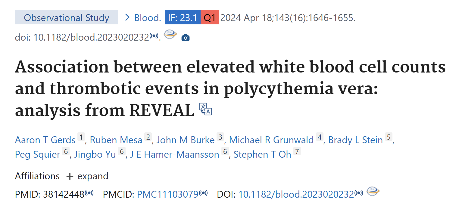 2024年4月18日,在《Blood》上一篇名為“Association between elevated white blood cell counts and thrombotic events in polycythemia vera: analysis from REVEAL”的研究論文被發(fā)表,本研究旨在評估真性紅細(xì)胞增多癥患者白細(xì)胞計(jì)數(shù)升高與血栓事件之間的關(guān)聯(lián)。