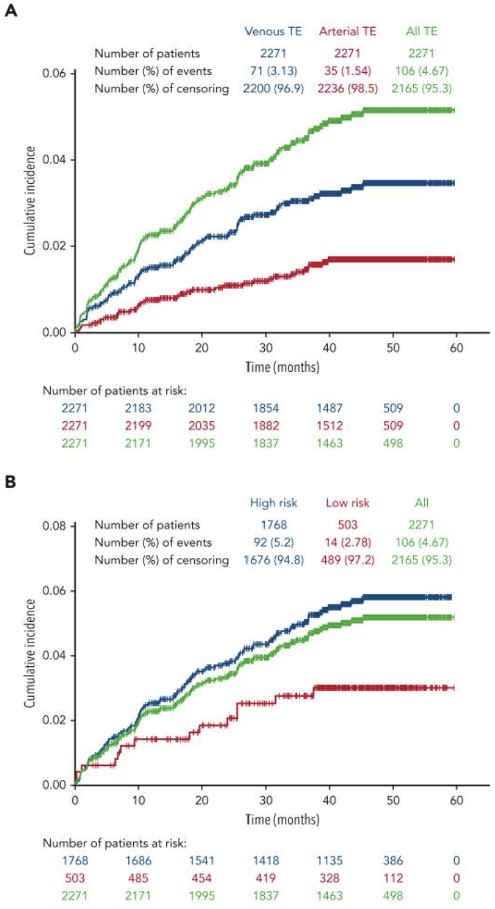 在本研究納入的2271名患者中;106名患者(4.7%)共有142例TE,整個入組期間的發(fā)生率為每100名患者年1.36例。在研究期間報(bào)告的106例TE患者中,大多數(shù)經(jīng)歷了次TE(n86;81.1%),其中20例(18.9%)經(jīng)歷了2至5次TE(補(bǔ)充表3)。此外,在入組前有TE病史的456例患者中,38例(8.3%)在研究期間經(jīng)歷過TE;在研究期間經(jīng)歷過TE的患者中,有35.8%在入組前有TE病史。靜脈TE比動脈TE更頻繁,入組時高PV患者比低危PV患者更有可能出現(xiàn)TE(圖1A-B)。在總共142例TE中,100例為靜脈事件,最常見的是深靜脈血栓形成(n=43),42例為動脈,最常見的是短暫性腦缺血發(fā)作(n=15)。在研究期間有TE病史的患者經(jīng)歷的53例TE中,有41例為靜TE,最常見的是深靜脈血栓形成(n=19),12例是動脈事件,最常見的是短暫性腦缺血發(fā)(n=5)。在研究期間接受TE的106名患者中,69.8%在入組時接受阿司匹林治療,23.6%接受抗凝治療。與學(xué)術(shù)中心(4.7%,n=18)相比,社區(qū)(4.9%,n=81)的TE患者比例相似;在未指定類型治療中心登記236 名患者中,有7名患有TE。