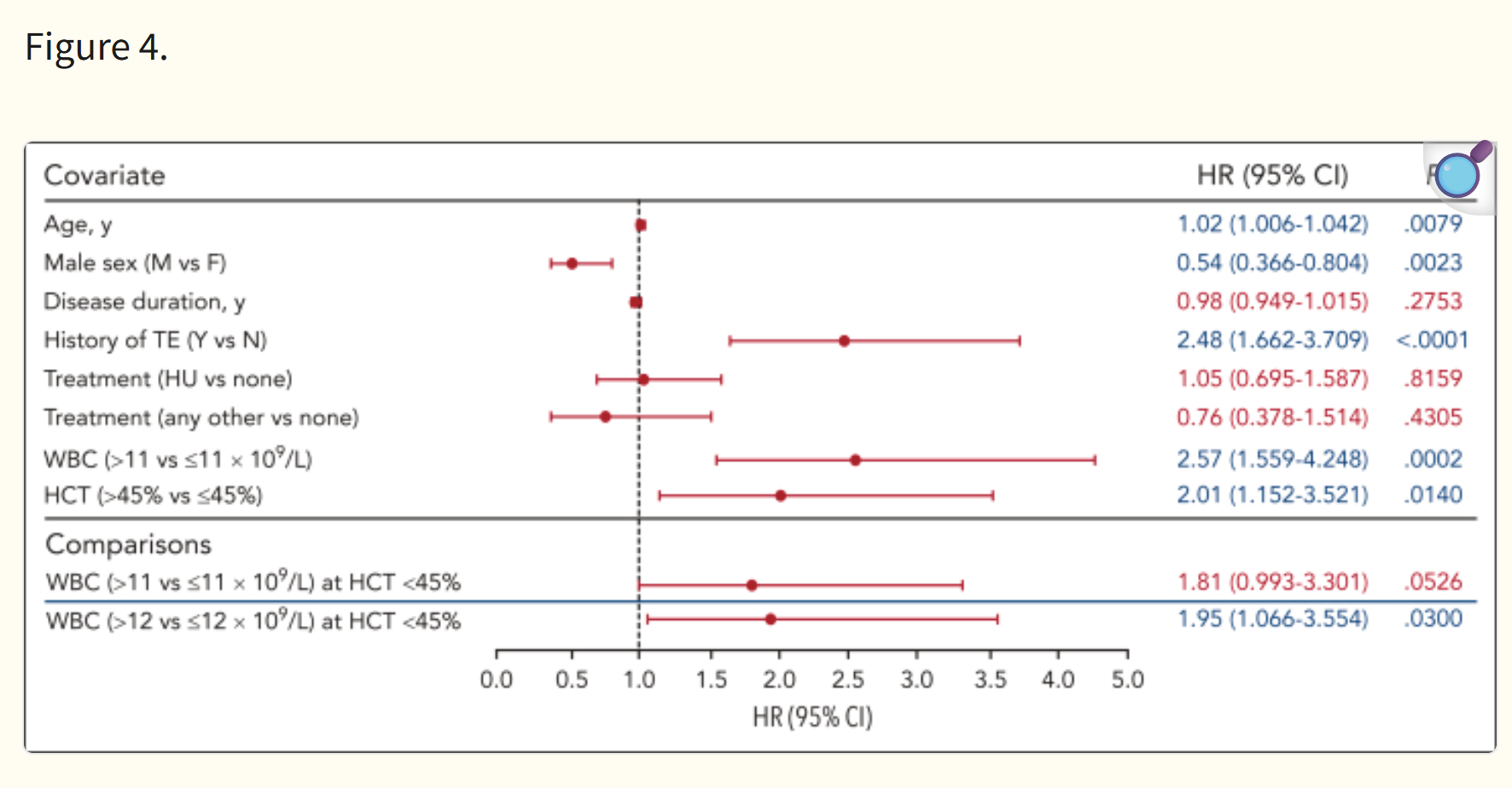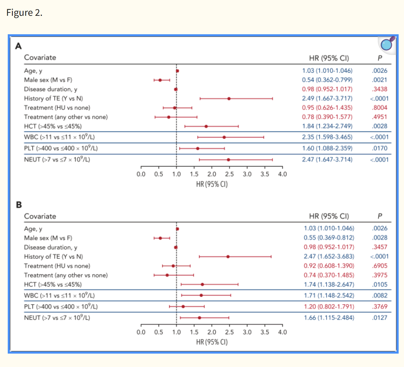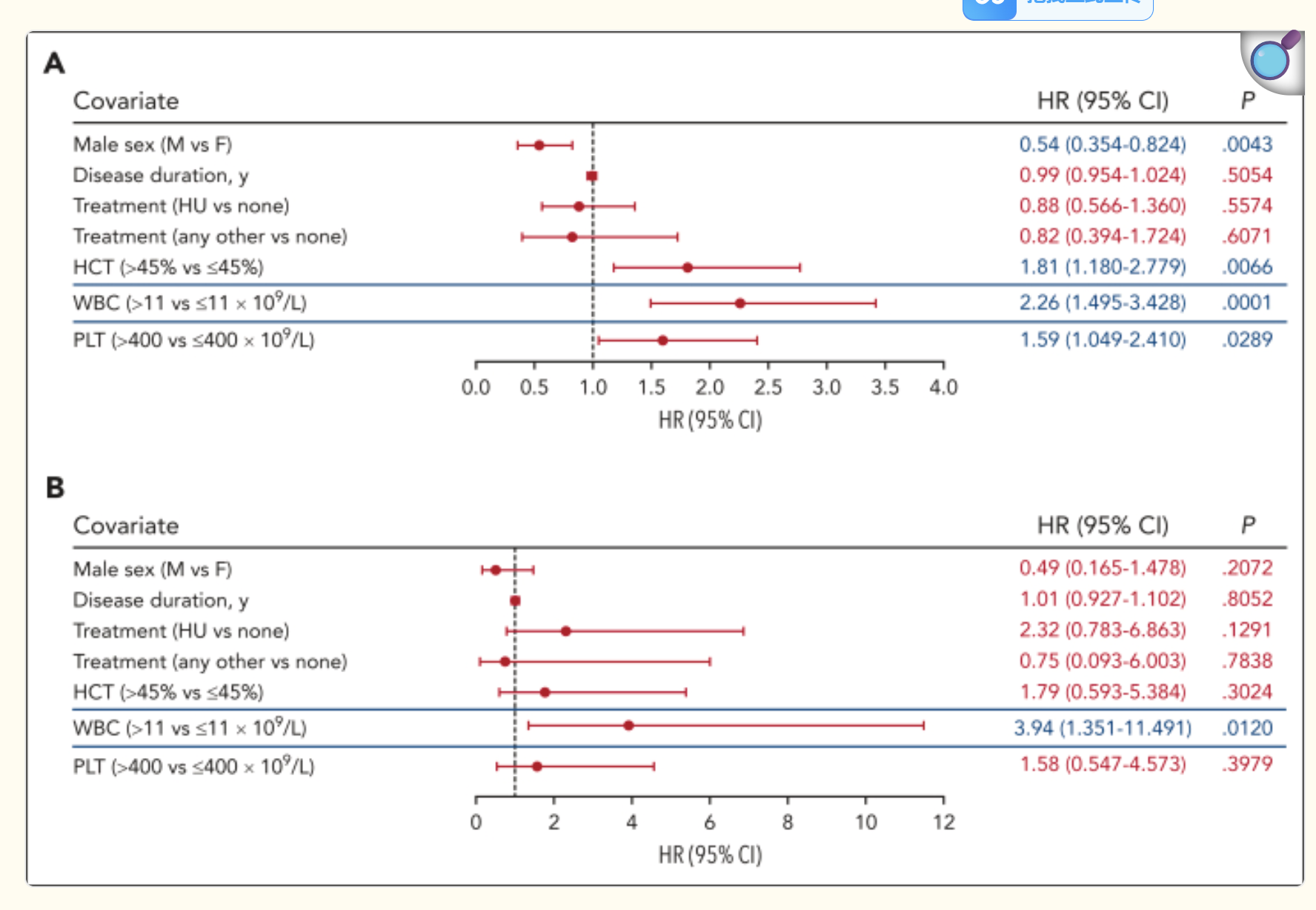 對入組后期間發(fā)生的首次TE進(jìn)行時間依賴性協(xié)變量分析。每種血細(xì)胞計(jì)數(shù)類型(血細(xì)胞比容、白細(xì)胞、血小板和中性粒細(xì)胞)使用TE前收集的最新實(shí)驗(yàn)室值以及年齡、性別、疾病持續(xù)時間、TE病史和治療的協(xié)變量獨(dú)立建模。TE發(fā)生與血細(xì)胞比容水平>45% vs ≤45%(P=0.0028)、白細(xì)胞計(jì)數(shù)>11 × 109/L vs ≤11 × 109/L(P <0.0001)、血小板計(jì)數(shù)>400 × 109/L vs ≤400 × 109/L(P=0.0170)和中性粒細(xì)胞絕對計(jì)數(shù)>7×109/L vs ≤7 × 109/L(P <0.0001)。還探索了白細(xì)胞計(jì)數(shù)(≥7× 109/L至<8.5 × 109/L與<7 × 109/L和≤8.5 × 109/L至<11 ×109/L與<7 × 109/L)和血小板計(jì)數(shù)(>600 × 109/L)的替代閾值,以進(jìn)一步表征上述觀察到的關(guān)聯(lián)的顯著性,并且沒有觀察到血細(xì)胞計(jì)數(shù)和TE發(fā)生之間的顯著關(guān)聯(lián)。