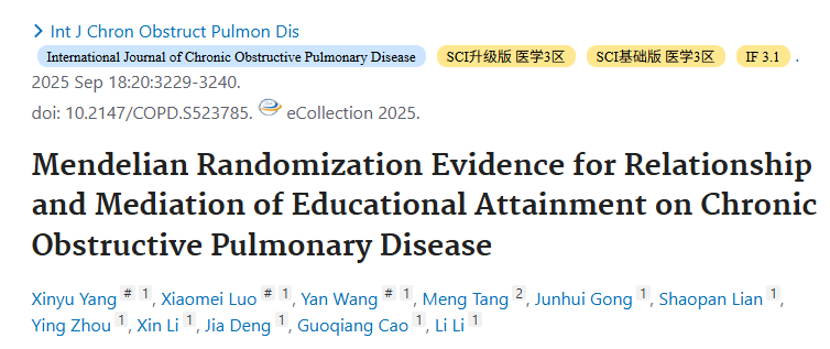 2025年9月18日,中國學(xué)者在《Int J Chron Obstruct Pulmon Dis》發(fā)表一項孟德爾隨機(jī)化(MR)研究,通過MR方法,探討教育水平(EA)與慢性阻塞性肺病(COPD)發(fā)病和住院之間的因果關(guān)系,并進(jìn)一步利用多變量MR(MVMR)和兩步MR,分析EA對COPD的潛在中介機(jī)制。
