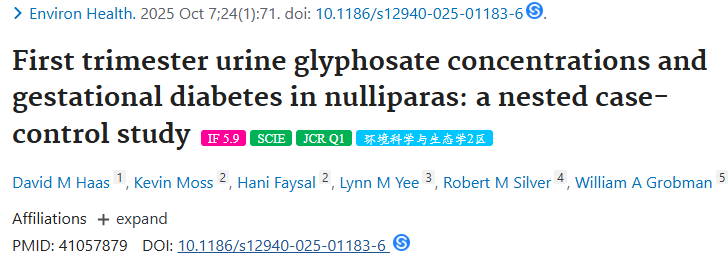 2025年10月,外國學者在《Environmental Health》(中科院醫(yī)學2區(qū),IF=5.9)發(fā)表標題為:“First trimester urine glyphosate concentrations and gestational diabetes in nulliparas: a nested case-control study”的研究論文。